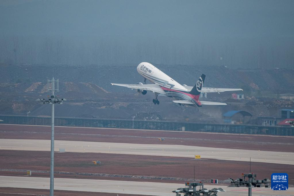 An air freighter flies over the Ezhou Huahu Airport in Ezhou, Central China's Hubei province, March 19, 2022. [Photo/Xinhua]