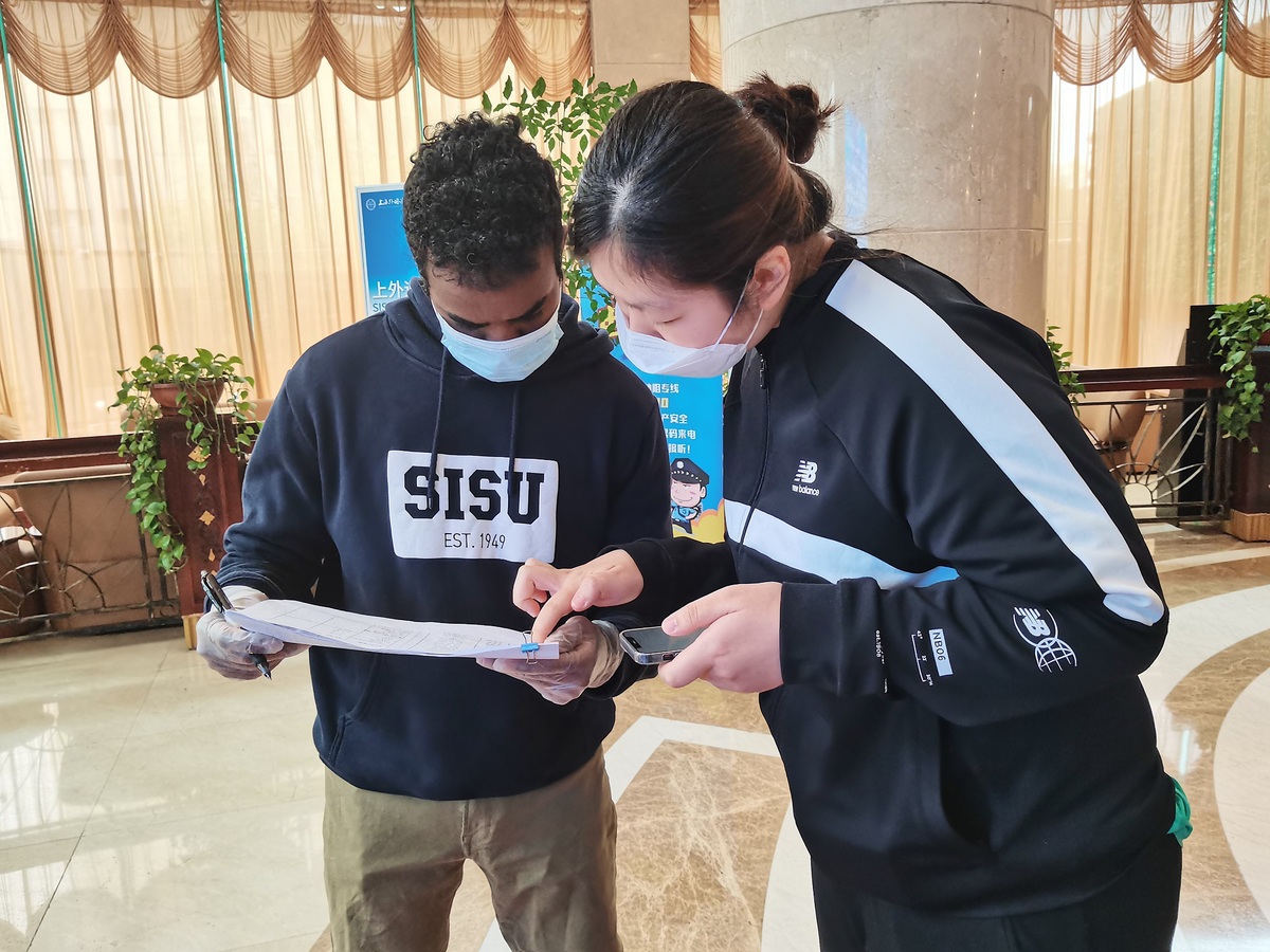 Liyicatalina Wuxu, a student at the Shanghai International Studies University, has been helping to check the number of students in each dormitory every night, register nucleic acid results and guide students during mass testing.