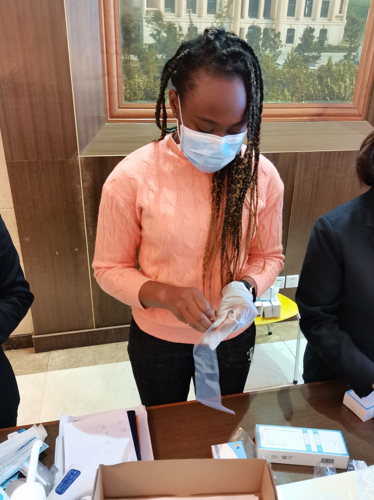 Ogechukwu Mary Elui from Nigeria volunteers to distribute antigen reagent to students at Shanghai International Studies University. [Photo provided to chinadaily.com.cn]