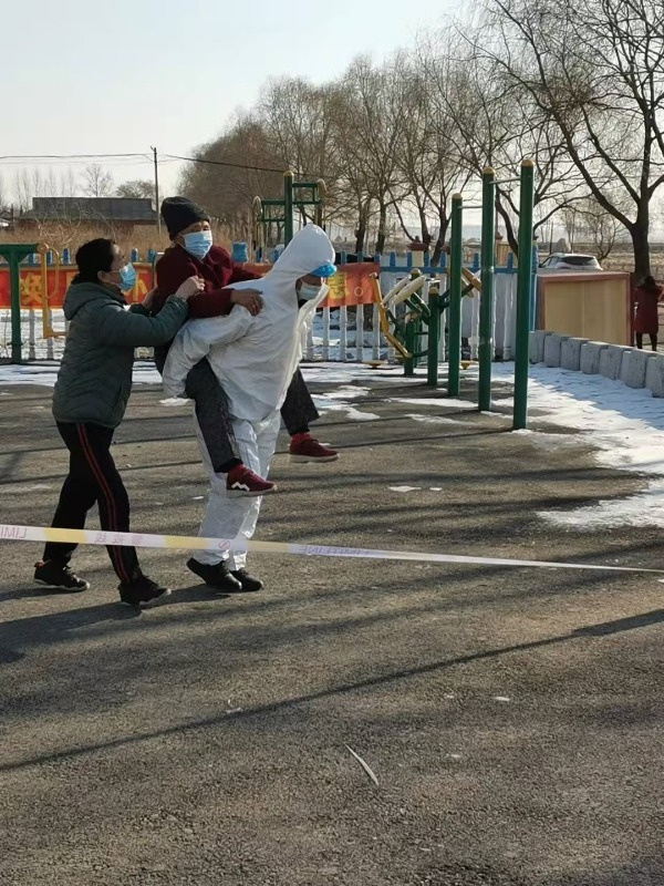 A volunteer carries an elderly in Changchun, Northeast China's Jilin province. [Photo provided to chinadaily.com.cn]