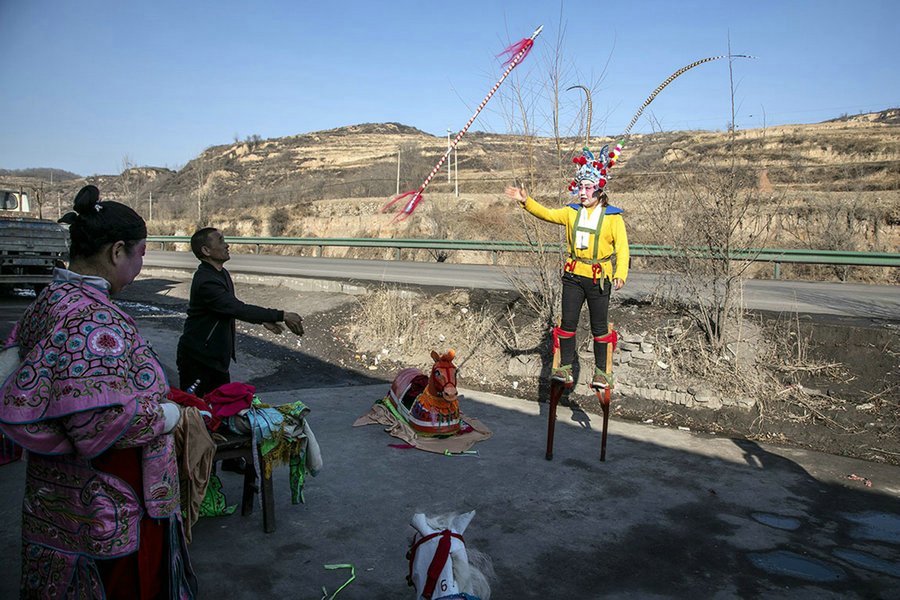 Residents practice their Shouyang bamboo horse performance skills in Guojiagou, Shouyang county, Shanxi province. [Photo by Tian Zhaoyun/For chinadaily.com.cn]
