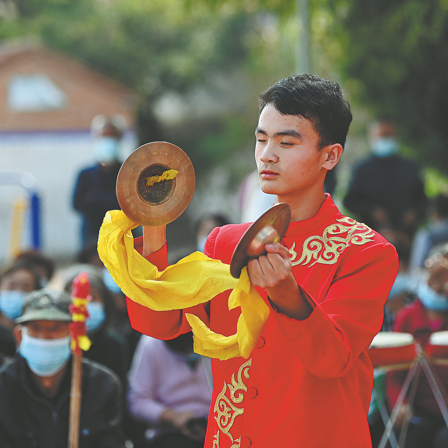 Wang Wenjie plays cymbals during a performance in Beishan village, Lingchuan town, Shanxi province. [Photo by
