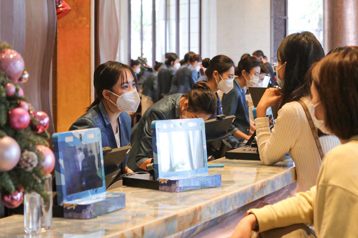 Staff members help tourists at the check-in desk in Atlantis Hotel in Sanya, South China's Hainan province, Dec 29, 2022. [Photo/Xinhua]