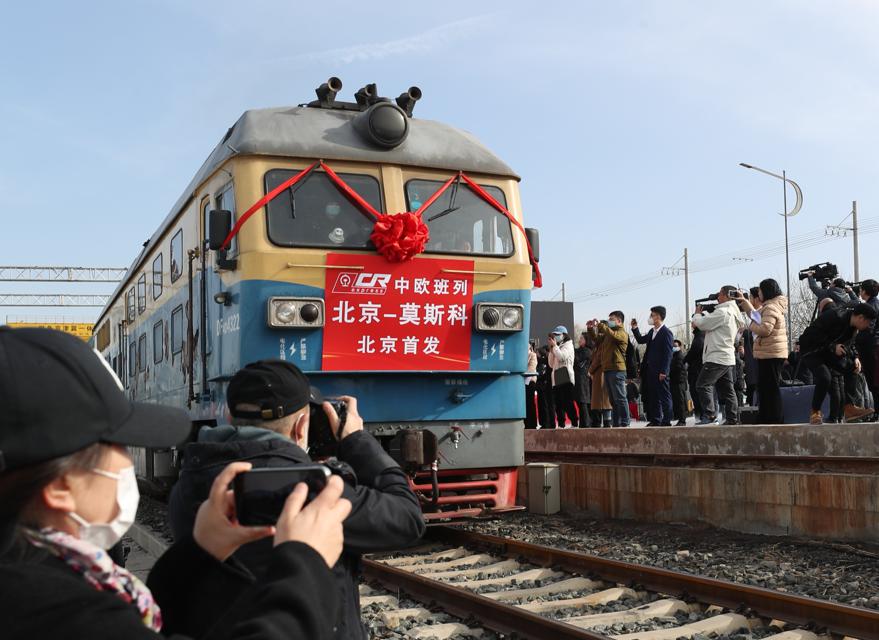 A China-Europe freight train, the first of its kind from the capital, left Mafang Station in Beijing's Pinggu district at 9:20am on Thursday. [Photo by Zou Hong/China Daily]