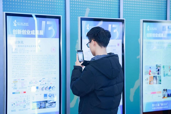 A student visits the exhibitio of the 13th "Challenge Cup" Chinese College Students Entrepreneurship Comptition. [Photo provided to chinadaily.com.cn]