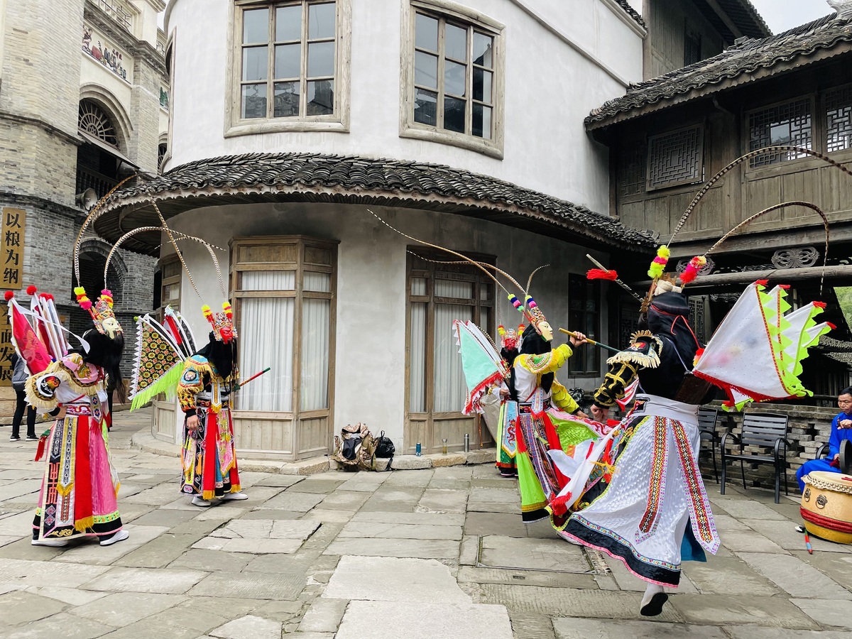 Inheritors of intangible heritage showcase a traditional opera at Wujiang Village Resort in Guizhou province. [Photo by Zhao Yandi and local media/Provided to chinadaily.com.cn]