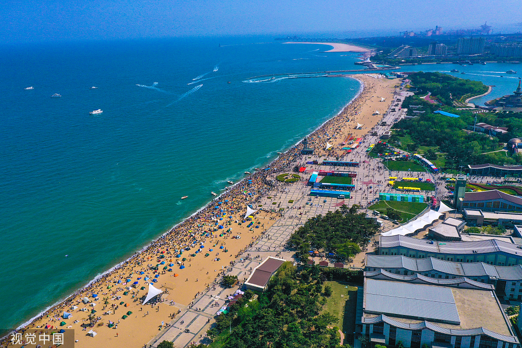An aerial photo of the tourists setting up tents is seen at the Wanpingkou Seaside Scenic Spot in Rizhao, Shandong province, on May 1, 2023. [Photo/VCG]