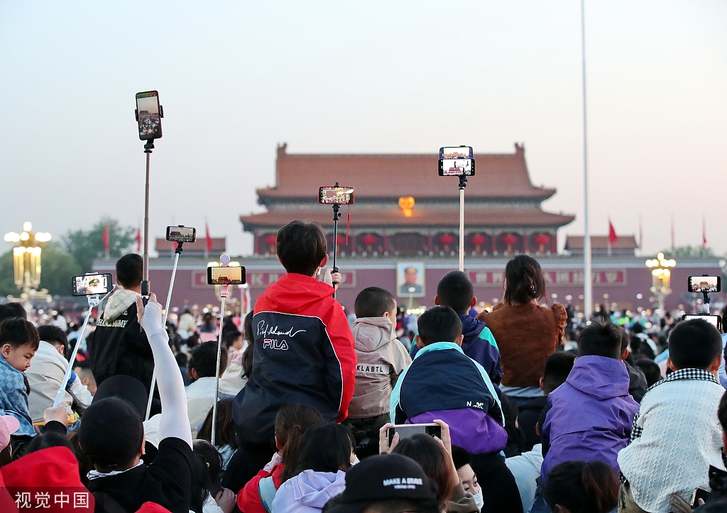 Tourists gather in Tian'anmen Square to watch the flag-raising ceremony in Beijing on May 1, 2023. [Photo/VCG]