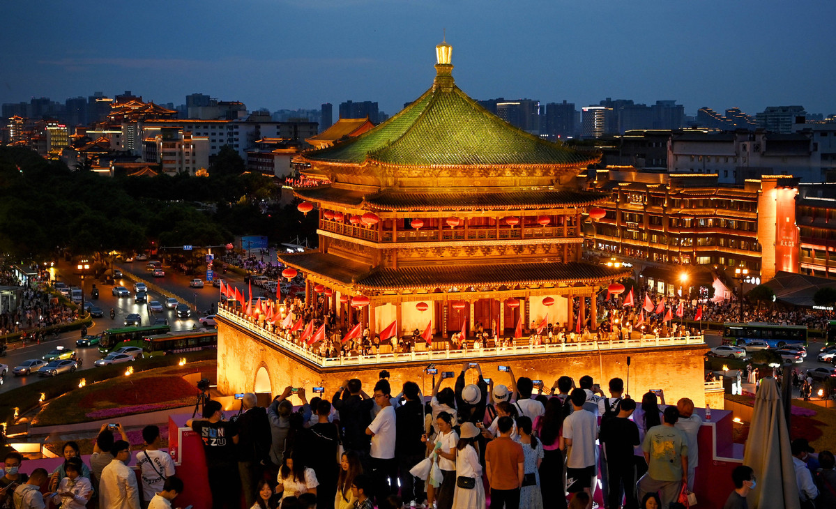 Tourists enjoy the night view of the Bell Tower in Xi'an, Shaanxi province, on May 2, 2023. [Photo/Xinhua]