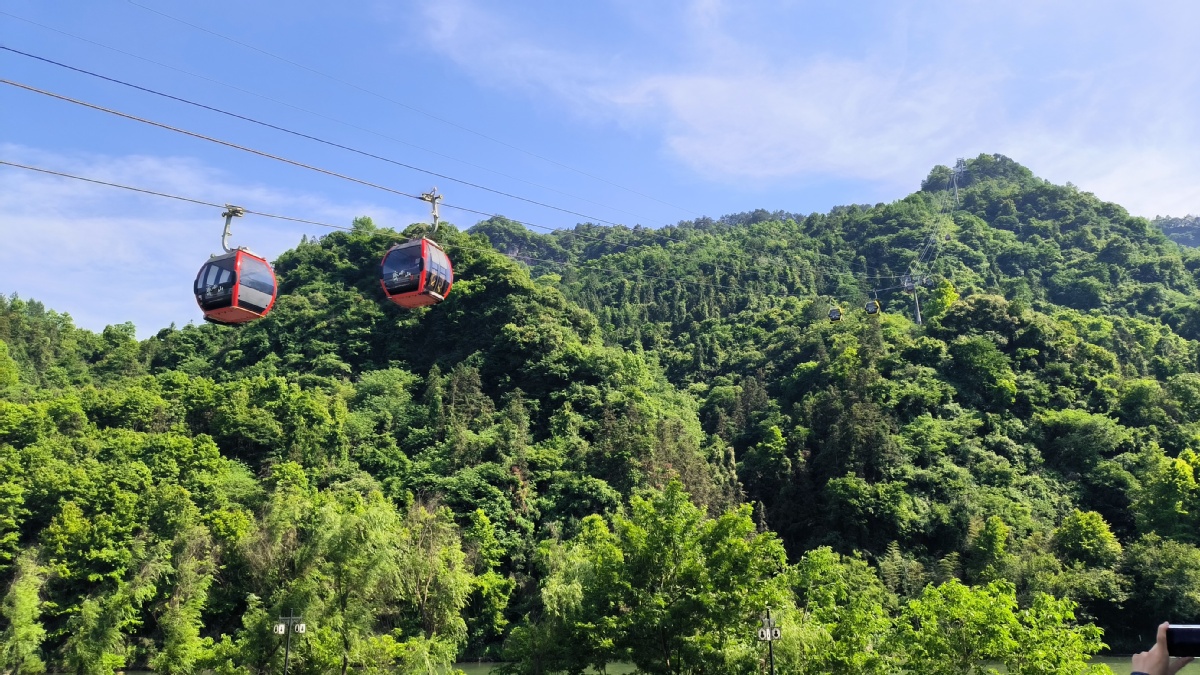 Visitors take cable cars to arrive at Qiyun Mountain in Xiuning county of Huangshan city, Anhui province, May 15, 2023. [Photo by Zhang Wenfang/chinadaily.com.cn]