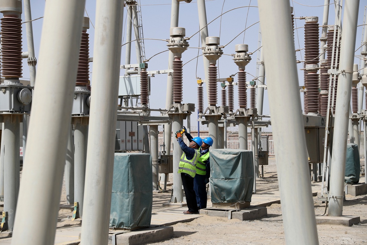 Engineers conduct inspection of a photovoltaic industrial park in Luopu county, Xinjiang Uygur autonomous region on May 17, 2023. [Photo by Wang Zhuangfei/chinadaily.com.cn]