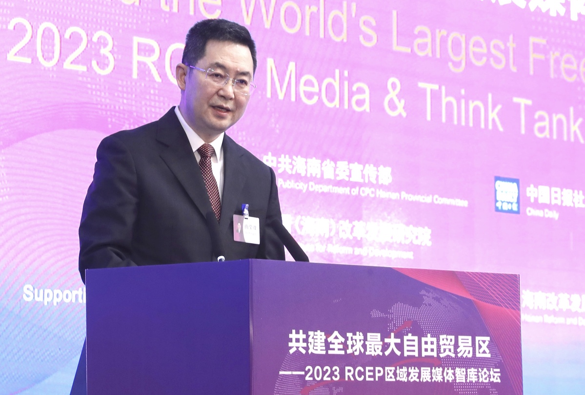 Qu Yingpu, publisher and editor-in-chief of China Daily, speaks at the opening ceremony of the third RCEP Media & Think Tank Forum in Haikou, Hainan province on Sunday. [Photo by Zou Hong/China Daily]