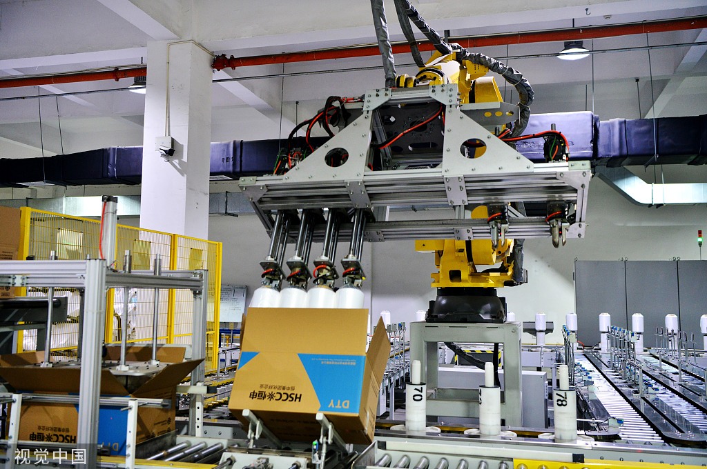 A robotic arm operates on the production line at an intelligent workshop of a chemical fiber textile enterprise in Fuzhou, Fujian province on May 31, 2023. [Photo/VCG]