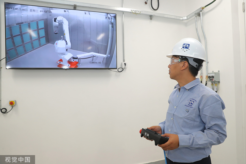 A worker remotely operates a robotic arm at an electric vehicle application center in North China's Tianjin on May 31, 2023. [Photo/VCG]