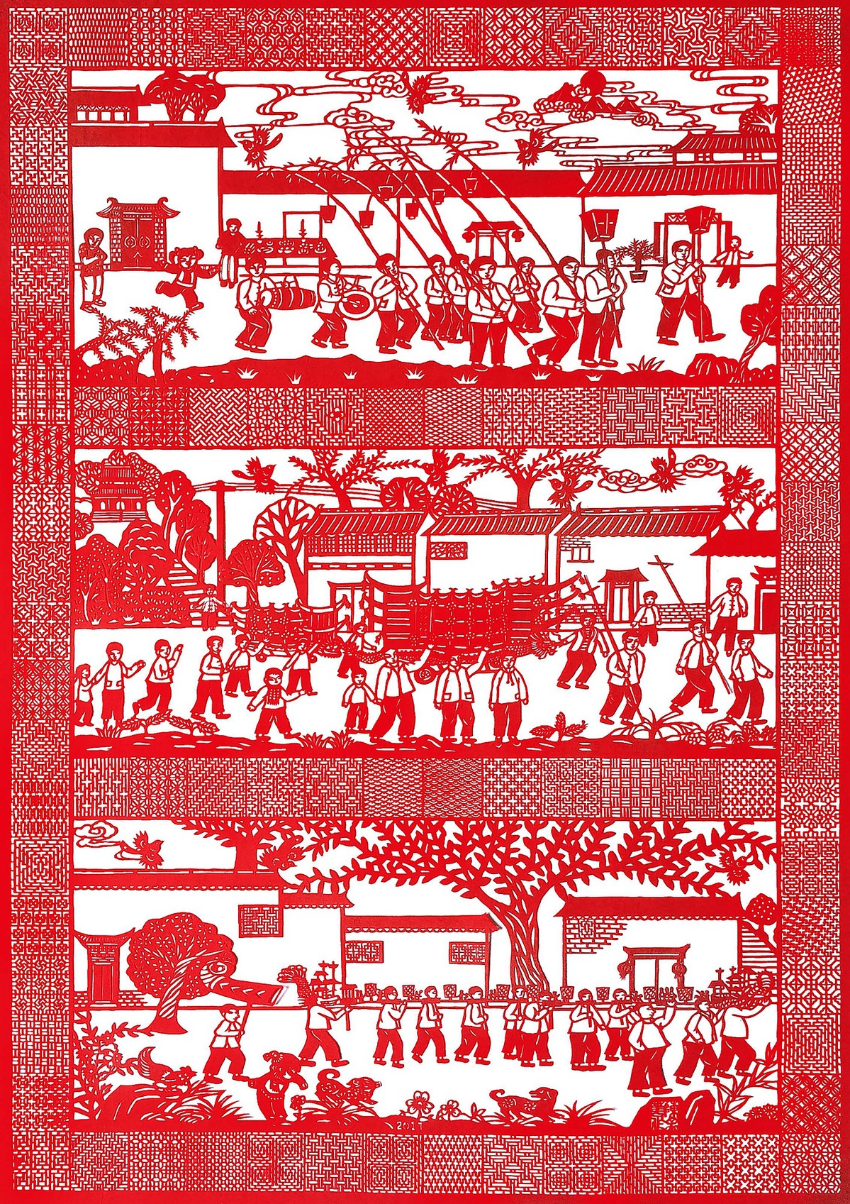 A fine line paper cutting work depicting people celebrating the Spring Festival. [Photo provided to chinadaily.com.cn]