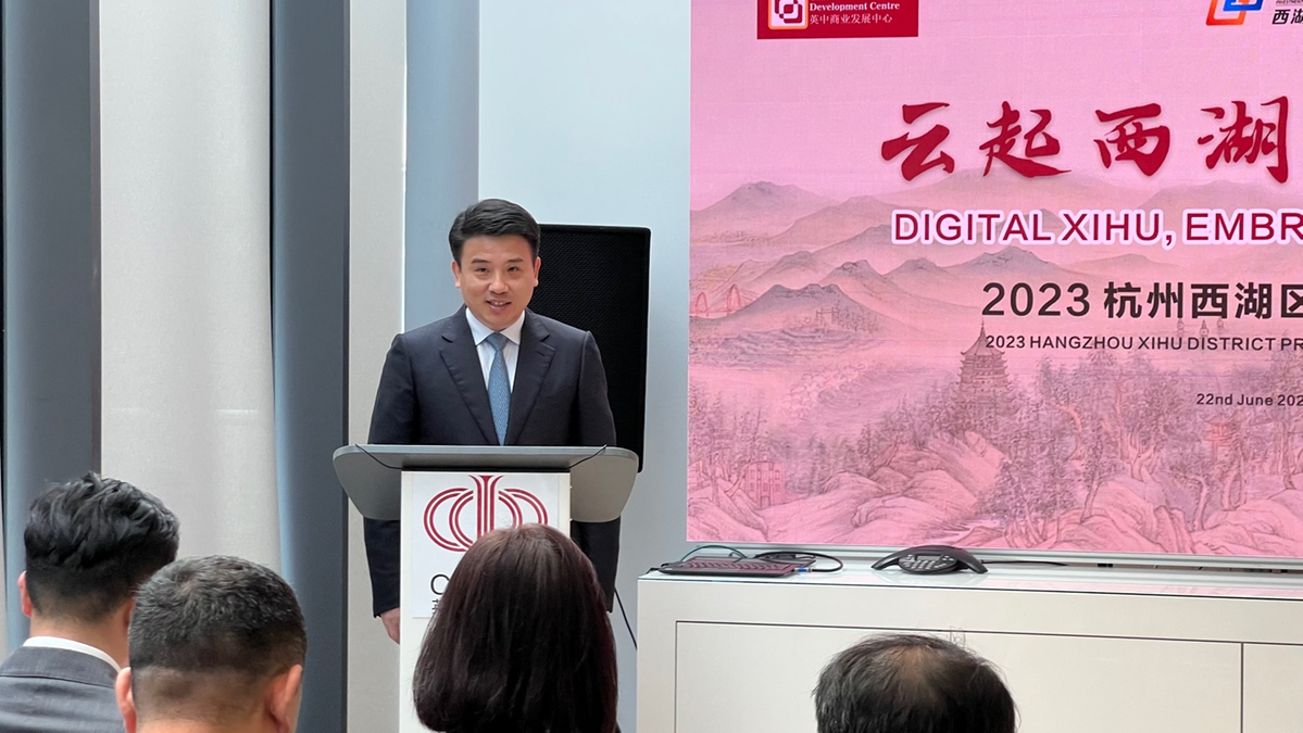 Dong Yumin, party secretary of Xihu district, made the opening remarks. He introduced attendees to the investment environment and development priorities of the district, and also the long-term connection between Hangzhou and London.