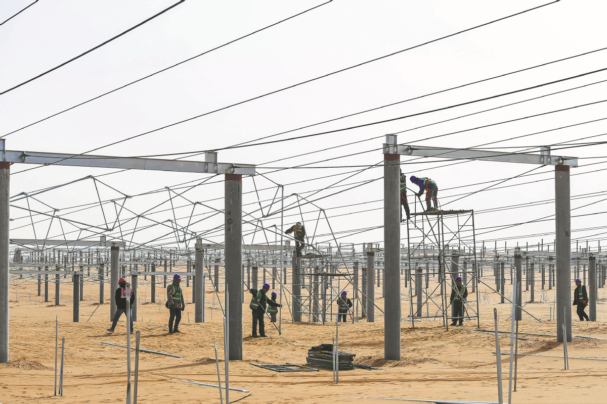 Workers set up frameworks for a solar power project in Kubuqi desert in the Inner Mongolia autonomous region. [Photo/Xinhua]