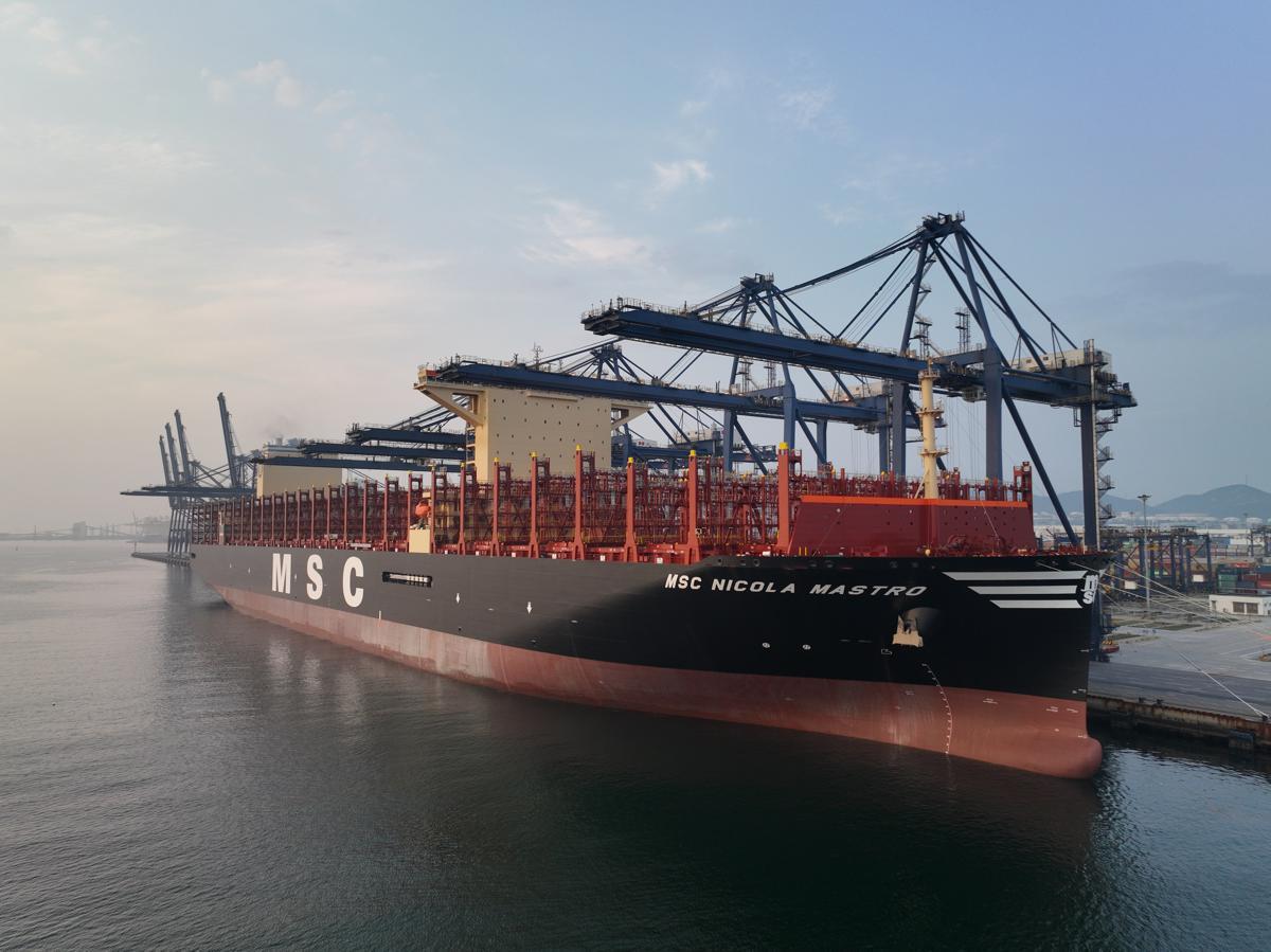 MSC Nicola Mastro, one of the world's largest 24,100 twenty-foot equivalent unit (TEU) ultra-large container ships, docked on Saturday at the Dalian Port container terminal in Jinpu New Area of Dalian, Liaoning province. [Photo by Yu Xinwen/For chinadaily.com.cn]