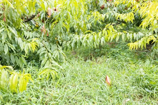 In the Yueya peach orchard, peach trees are lying next to overgrown weeds, which doesn't look appealing at all. But it's in fact an insider's trick for growing peaches. One local farmer said that the peach is afraid of the sun burn and gas burn; in addition to bags to prevent sun exposure, the grass is used to balance the orchard climate, boosting moisturizing and soil permeability.