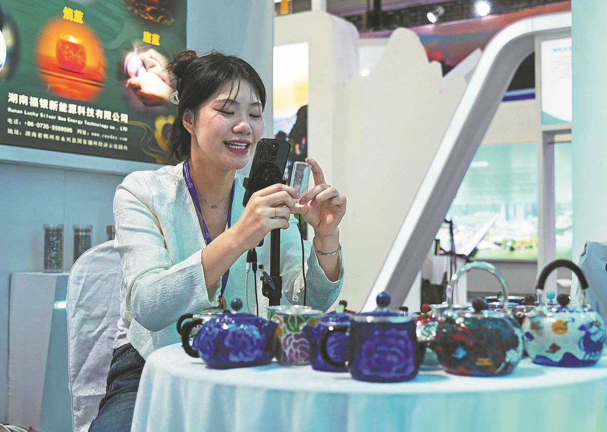 A livestreaming hostess promotes ceramic products during a cross-border e-commerce fair in Changsha, Hunan province, over the weekend. LIN DAOHUI/FOR CHINA DAILY
