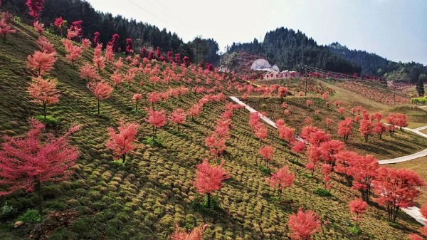 As you enter the scenic area, you will be greeted by a mountain covered with maple trees in vibrant autumn colors and an intertwining forest of ginkgo trees. In addition, the blooming pink muhly grass creates a stunning "wave" effect, resembling a colorful oil painting.