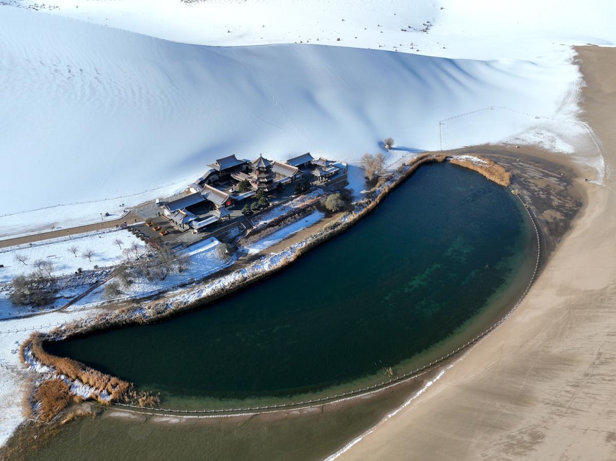 Snowy scenery in Yueyaquan, a scenic spot on Mingsha Mountain in Dunhuang, Gansu province on Wednesday. [Photo by Zhang Xiaoliang/For chinadaily.com.cn]