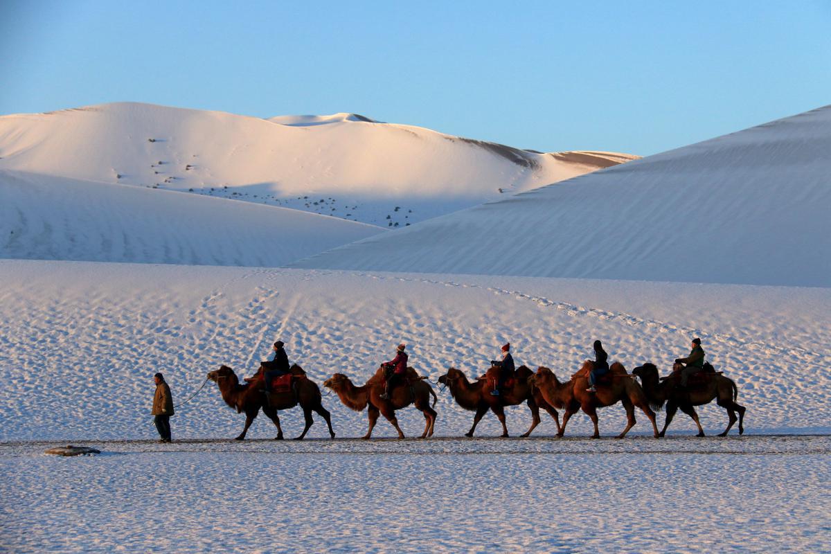 Snowy scenery in Yueyaquan, a scenic spot on Mingsha Mountain in Dunhuang, Gansu province on Wednesday. [Photo by Xi Gang/For chinadaily.com.cn]