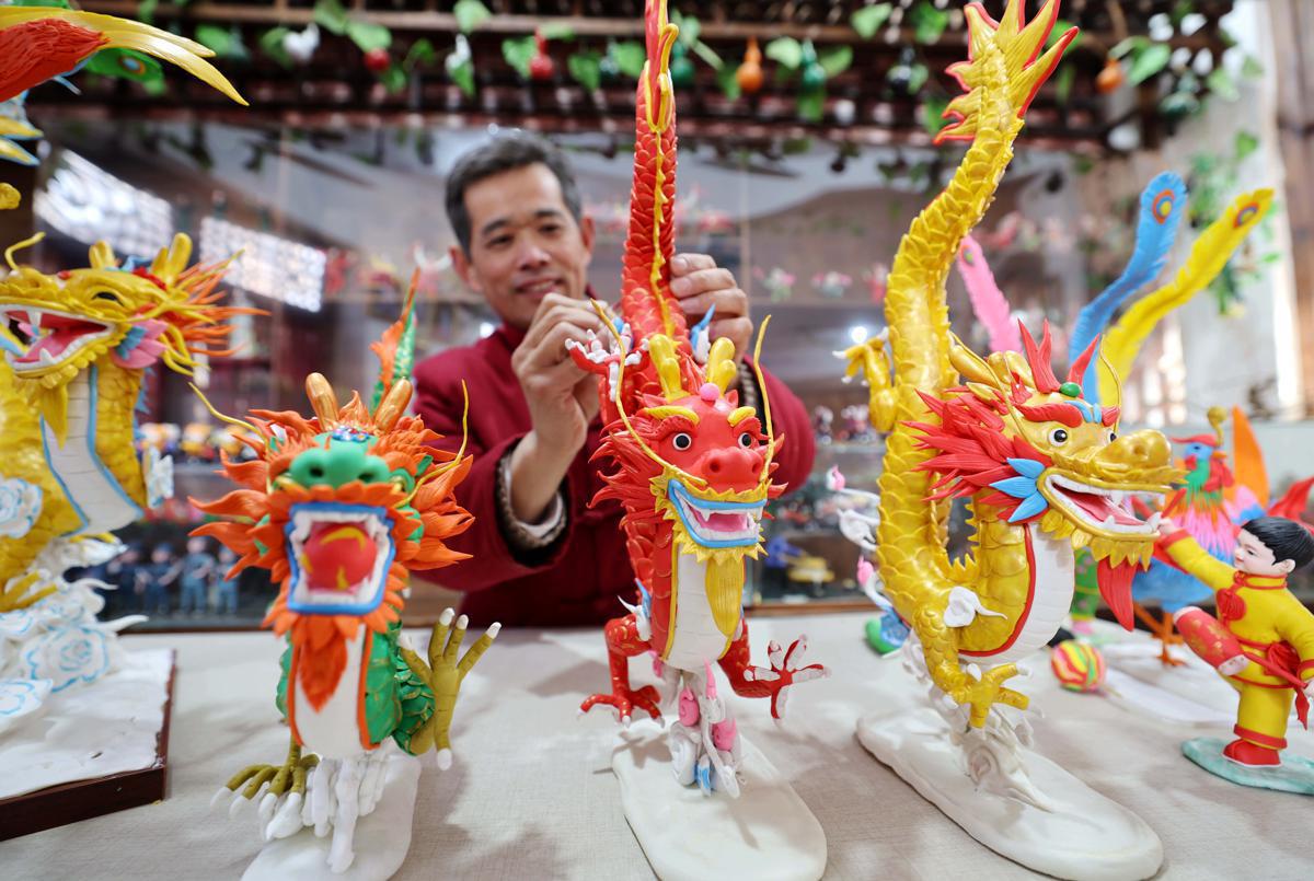Zuo Ansheng from the Hongshizhai Intangible Cultural Heritage Museum in Yinan county, Linyi, has created a series of dragon dough sculptures. One sculpture titled "Dragon and Phoenix Bring Auspiciousness" captures the essence of the upcoming New Year celebrations.