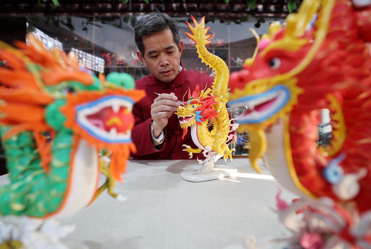 Zuo Ansheng from the Hongshizhai Intangible Cultural Heritage Museum in Yinan county, Linyi, creates a series of dragon dough sculptures. [Photo by Wang Yanbing/For chinadaily.com.cn]