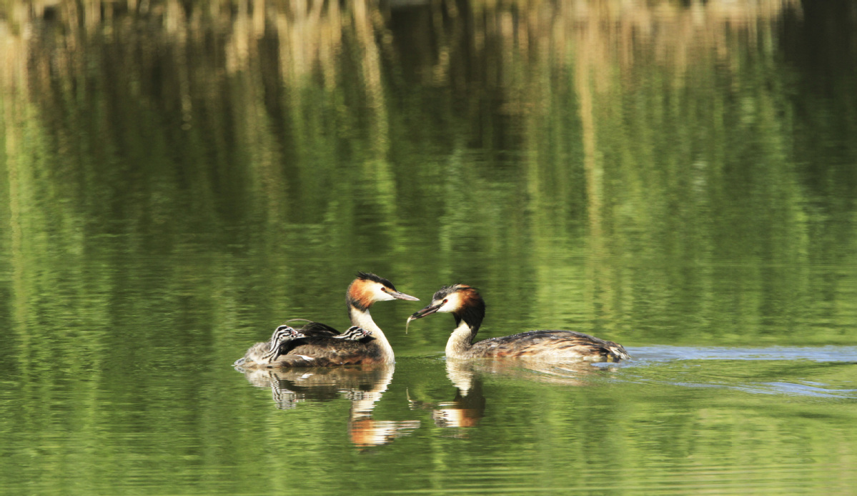 At Runquan Lake Park in Ganzhou district, Zhangye city, young grebes are hatching, playing and foraging in the lake.