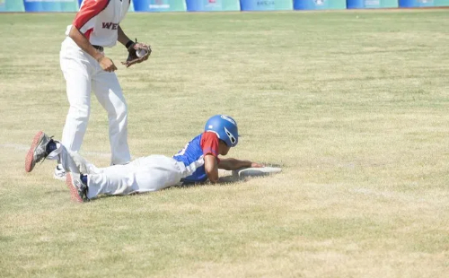 A Xiaoyue player slides safely back to third base. [Photo/Tide News]