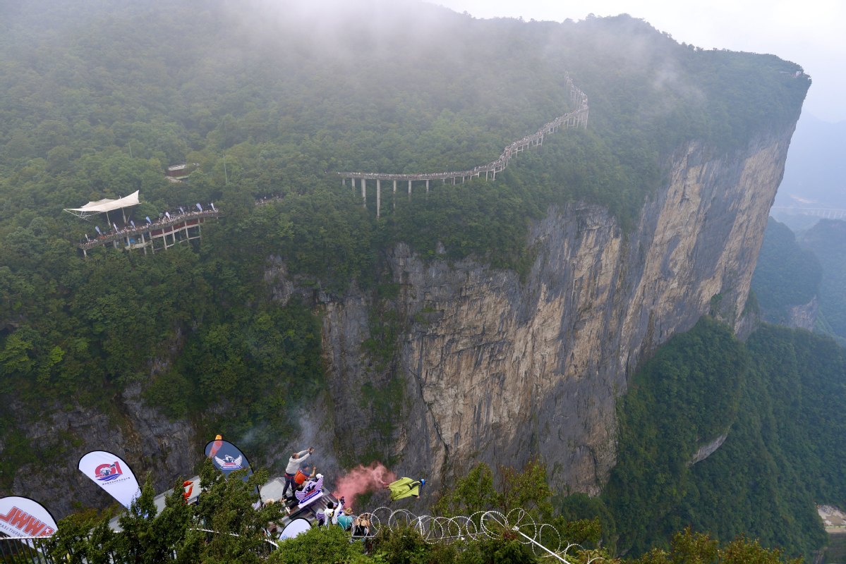 Foreign competitors at the 10th World Wingsuit League Wingsuit Flying World Championship take part in the competition at the Tianmen Mountain National Forest Park in Zhangjiajie, Hunan province, Sept 16, 2024. [Photo by Zhu Xingxin/chinadaily.com.cn]