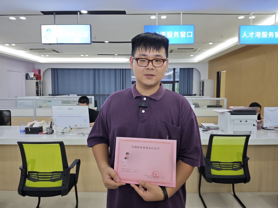 Chu Chen-szu, from Hsinchu, Taiwan, and a graduate of journalism, recently obtained her internet marketing professional license in Pingtan, East China's Fujian province, this month. She believes that the certification will greatly benefit her career development.