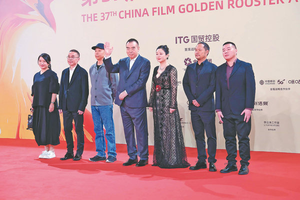 Chen Kaige (middle) claims Best Director for The Volunteers: To the War at the 37th Golden Rooster Awards in Xiamen, Fujian province, on Saturday. [Photo by MA WENYI/FOR CHINA DAILY]