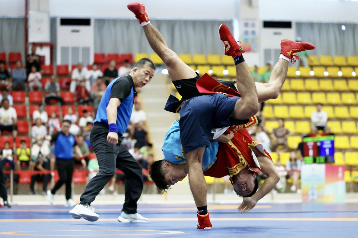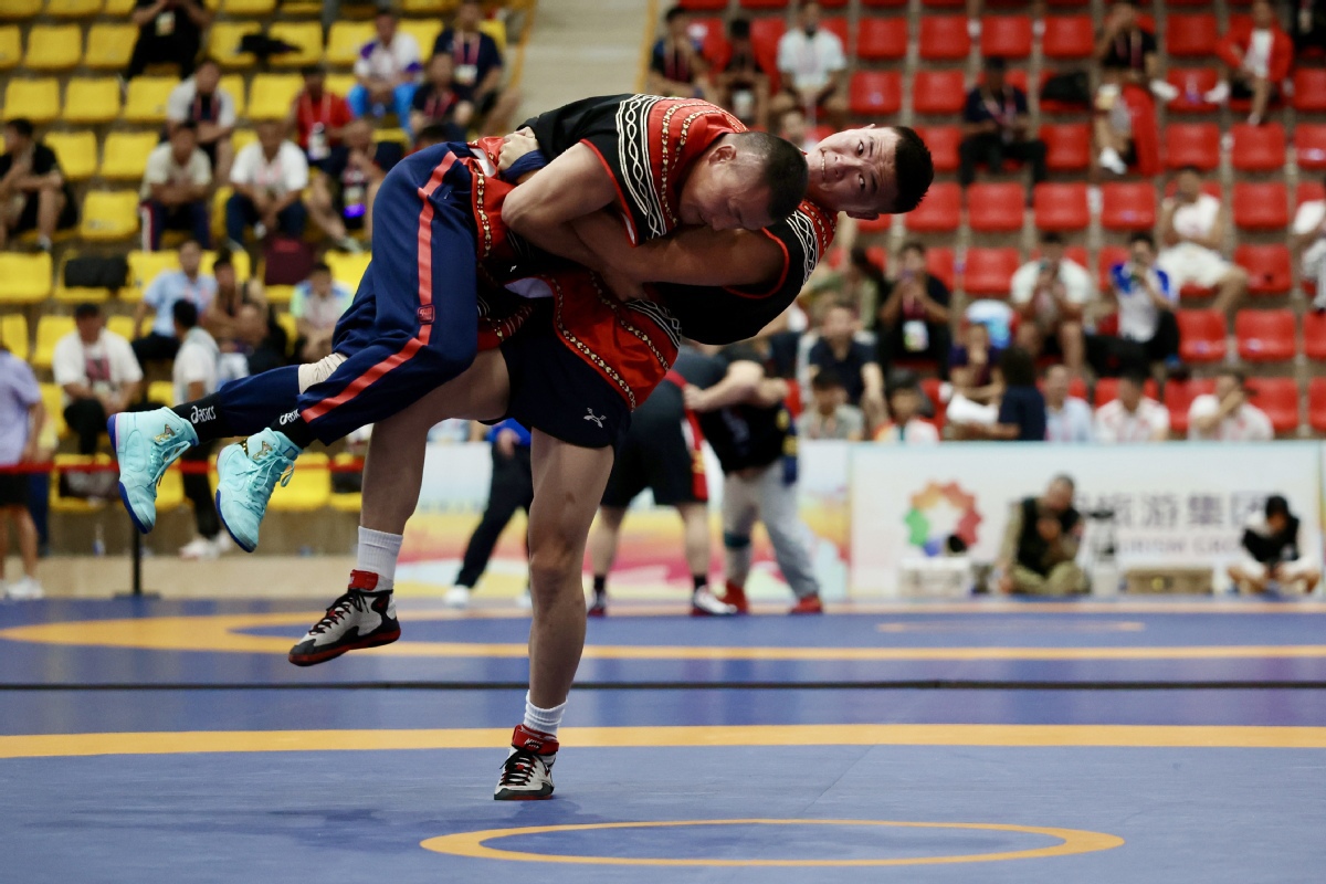 Contestants compete in a Uygur wrestling match during the 12th National Traditional Games of Ethnic Minorities of the People's Republic of China on Nov 24, 2024 in Sanya, South China's Hainan province. [Photo by Wei Xiaohao/chinadaily.com.cn]