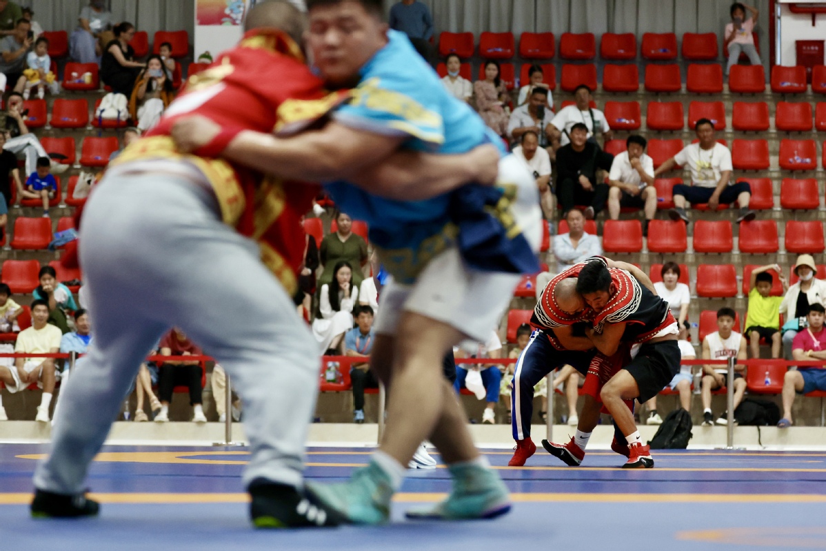 Contestants compete in a Tibetan wrestling match during the 12th National Traditional Games of Ethnic Minorities of the People's Republic of China on Nov 24, 2024 in Sanya, South China's Hainan province. The wrestling event of ethnic minorities at the games includes six categories: the Tibetan wrestling, Uygur wrestling, Yi wrestling, Mongolian wrestling, Hui wrestling and Korean wrestling. [Photo by Wei Xiaohao/chinadaily.com.cn]