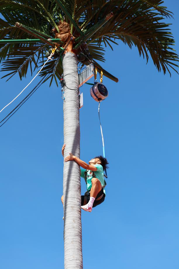 Coconut tree climbing tests speed, climbing technique, stamina, and core strength. Referee Li Yan explained that athletes are allowed to use their own climbing style and techniques, but strength and coordination are crucial.
