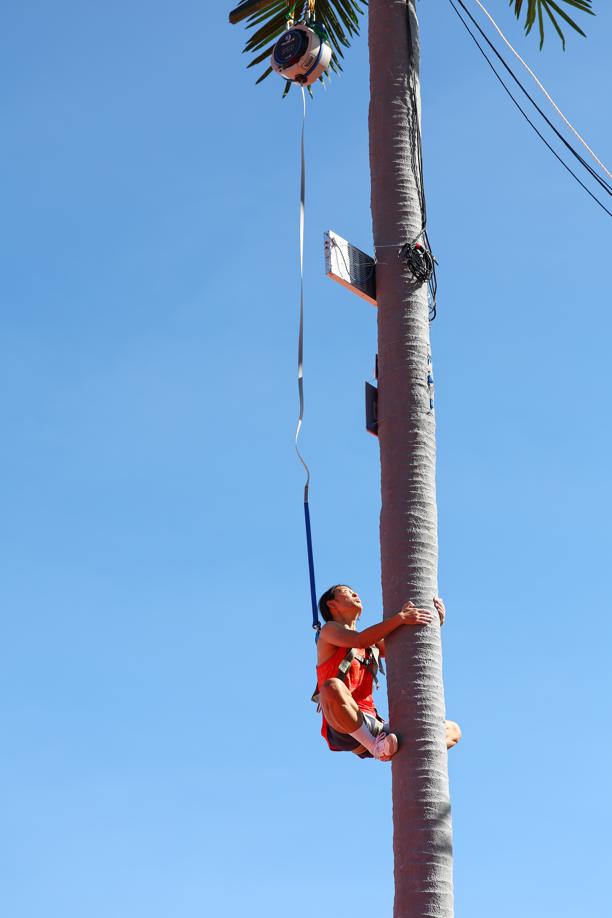 The sport involves athletes climbing artificial coconut trees to reach the top and touch the timing bell.