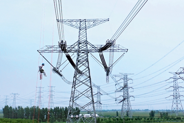 Liu Ruiying works on ultra-high-voltage, direct-current transmission lines in Tianjin.