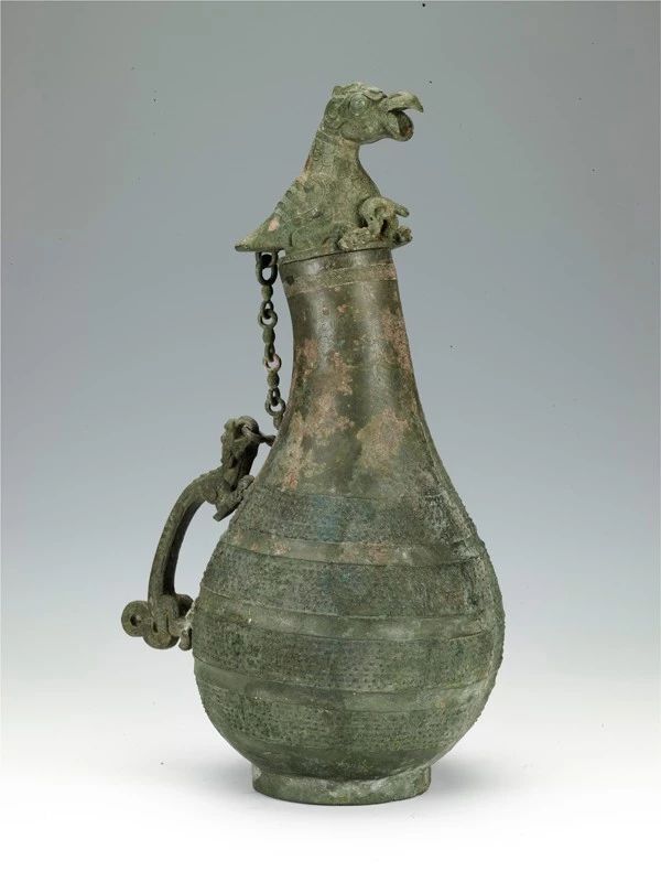 How many animals can you spot on this ancient bronze wine vessel? Dating from the Spring and Autumn Period (770-476 BC), this bronze jar resembles a delicate gourd, with its neck curving gently. A bird, perched on the lid as a knob, has its beak wide open and claws gripping two writhing snakes. A tiger-shaped handle holds a ring attached to the bird’s tail by a chain, reminiscent of steppe nomadic horse gear. The coiled dragon and rivet motifs on the vessel’s belly reveal the lush Chu culture of southern China.