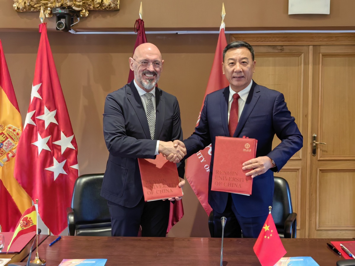 Zhang Donggang (right), Party secretary of Renmin University of China, and Joaquín Goyache Goñi, rector of Complutense University of Madrid, jointly signed a cooperation agreement between the two universities. [Photo provided to chinadaily.com.cn]