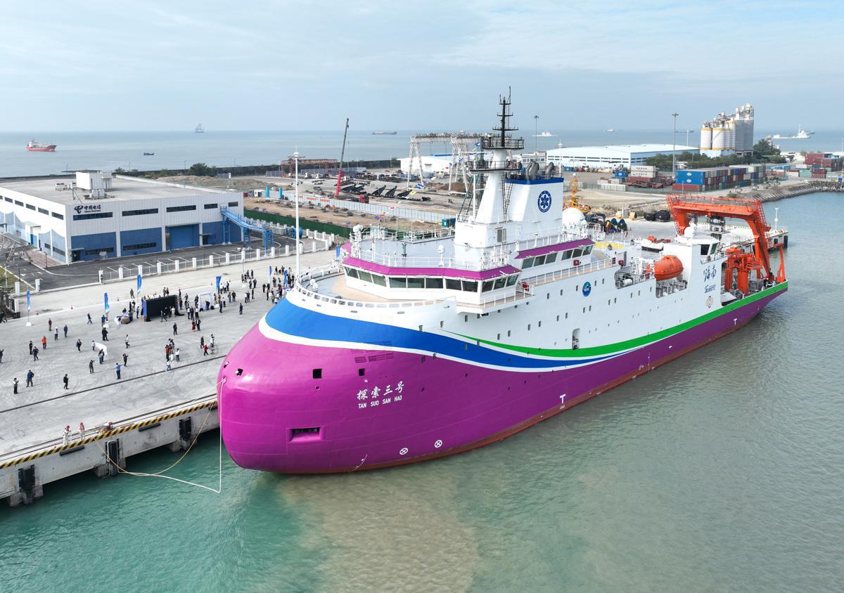 The groundbreaking scientific research vessel TAN SUO SAN HAO, also known as Exploration 3, marked its debut at the Nanshan Port Public Scientific Research Pier in Sanya Yazhou Bay Science and Technology City, Hainan province on Sunday morning.