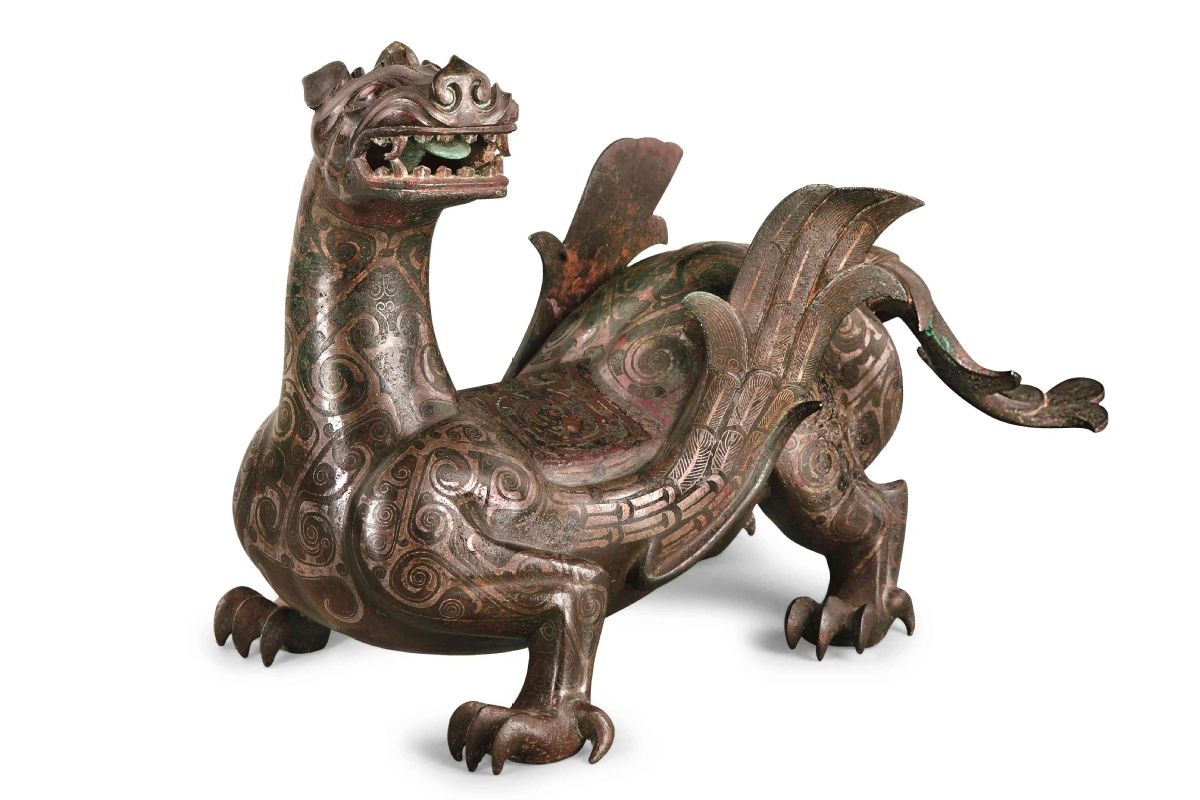 Bronze mythical beast with dual wings and inlaid with silver motifs, Warring States Period [Photo/Official WeChat account of Hebei Museum]