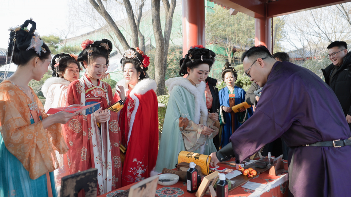 In the Tang Palace, tourists craft handmade fish lanterns, creat New Year's fortune rubbings and explore wooden New Year paintings in a thousand-year-old setting. Amid the beautiful scenery, visitors can also check out the New Year calendar inside Huaqing Palace, make their wishes for 2025 and share blessings and hopes for the future.
