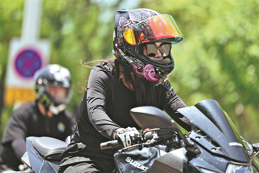 In her leisure time, Jiang Zhounan, 21, enjoys hitting the road on her motorbike.[Photo provided by Xu Peiqin/For China Daily]