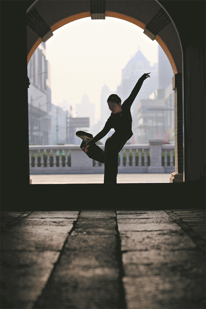 Jiang's silhouette is set against buildings in Nantong. [Photo provided by Xu Peiqin/For China Daily]