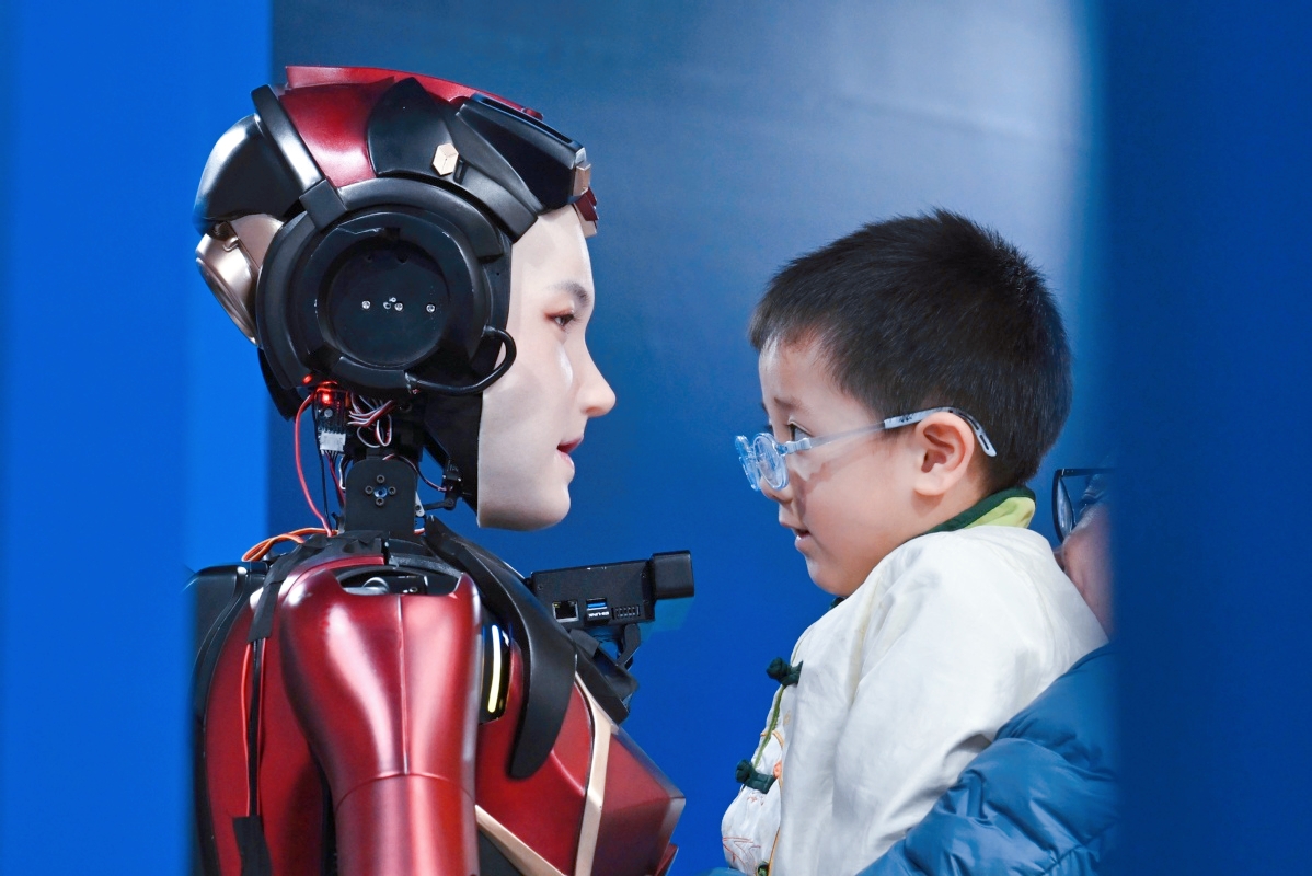 A young visitor scrutinizes a humanoid skin texture robot during the 2024 World Internet Conference & Light of Internet Expo in Wuzhen, Zhejiang province, on Nov 19. [TIAN JIANMING/FOR CHINA DAILY]