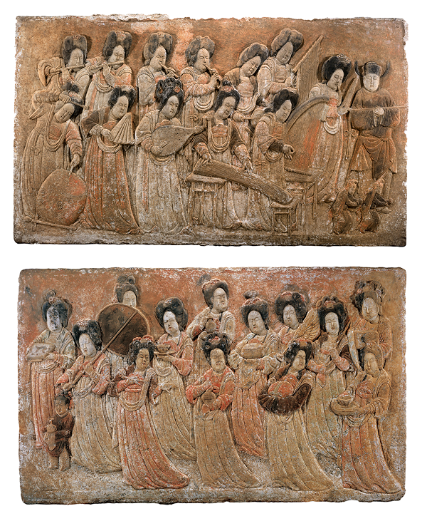 Painted stone reliefs depicting a music performance and a serving scene, Five Dynasties (907-960), from the collection of the Hebei Museum [Photo/Official WeChat account of the National Museum of China]