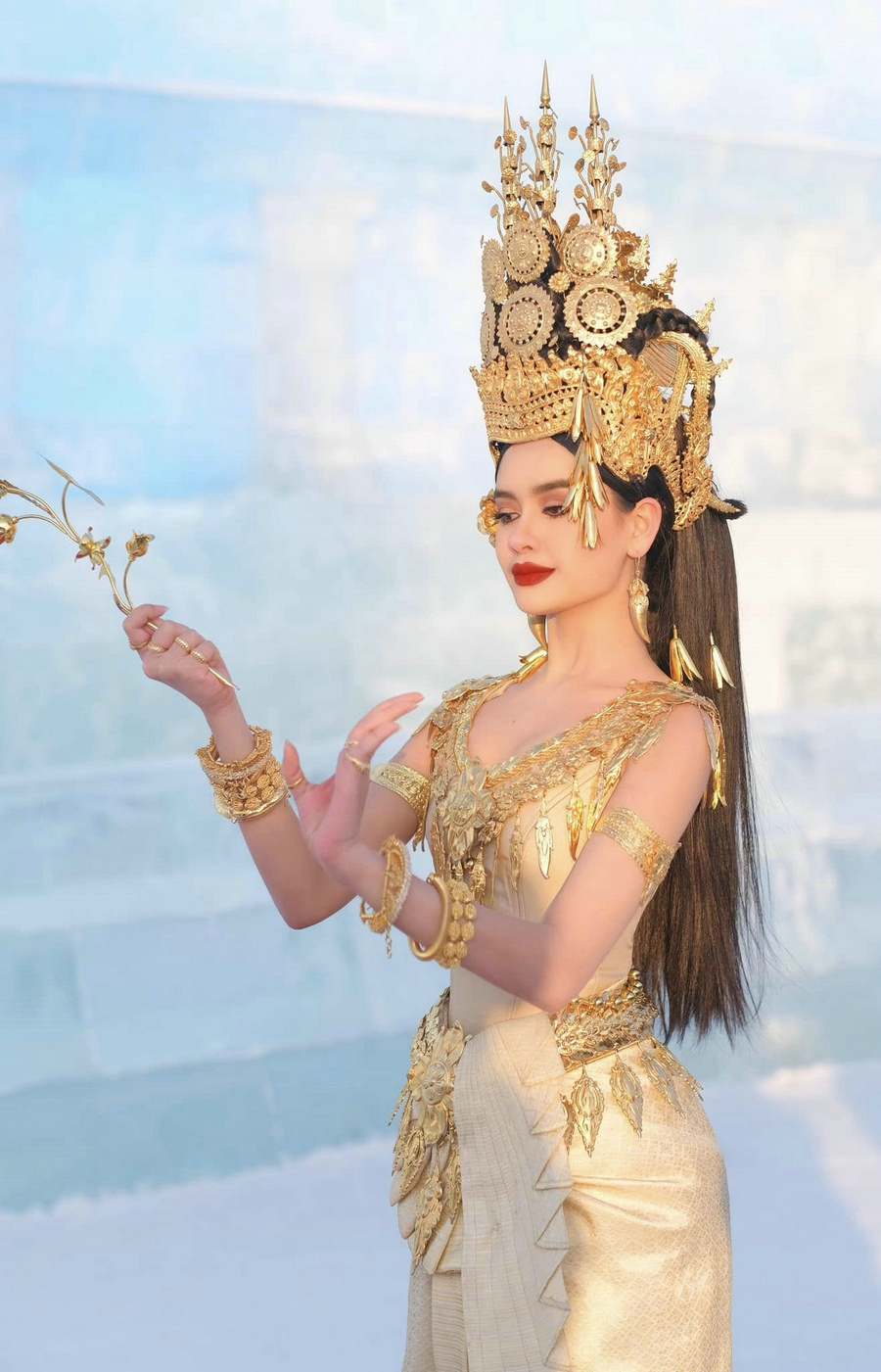 Cambodian artist Choury Laorhours performs the Apsara dance at the Harbin Ice and Snow World in Northeast China’s Heilongjiang province, on Jan 5, 2025. [Photo provided to chinadaily.com.cn]