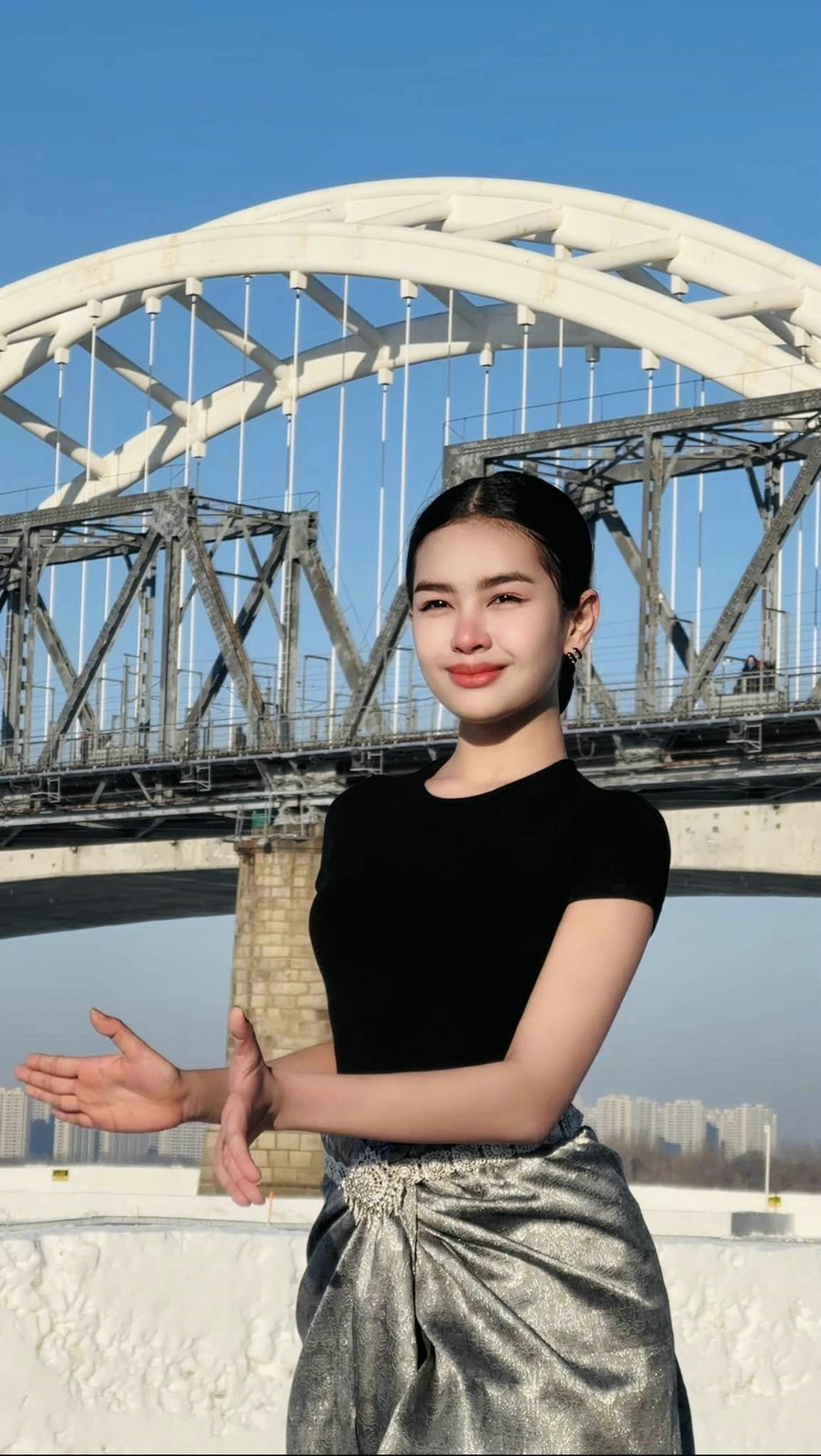 Cambodian artist Choury Laorhours rehearses the Apsara dance on the frozen Songhua River in Harbin, Northeast China’s Heilongjiang province, on Jan 4, 2025. [Photo provided to chinadaily.com.cn]